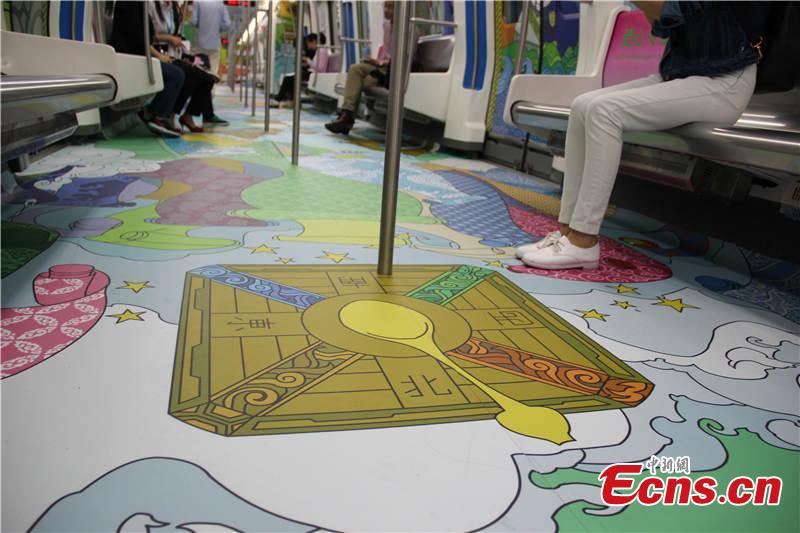| A subway train themed with Maritime Silk Road culture runs in Ningbo city, East China’s Zhejiang province, May 20, 2015. The train mainly uses cartoons and paintings to illustrate the ancient voyage route that connected Ningbo with many cities in other countries. Many people have taken the train to take pictures or better understand the region's history. (Photo: China News Service/Lin Bo) |