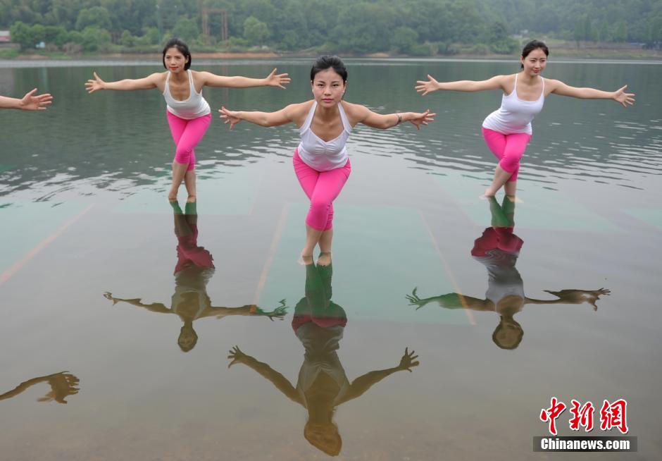 Several beauties perform Yoga on water in Shiyan Lake in Changsha, central China's Hunan province on May 20, 2015. (CNS/Yang Huafeng)
