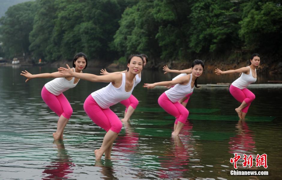 Several beauties perform Yoga on water in Shiyan Lake in Changsha, central China's Hunan province on May 20, 2015. (CNS/Yang Huafeng)