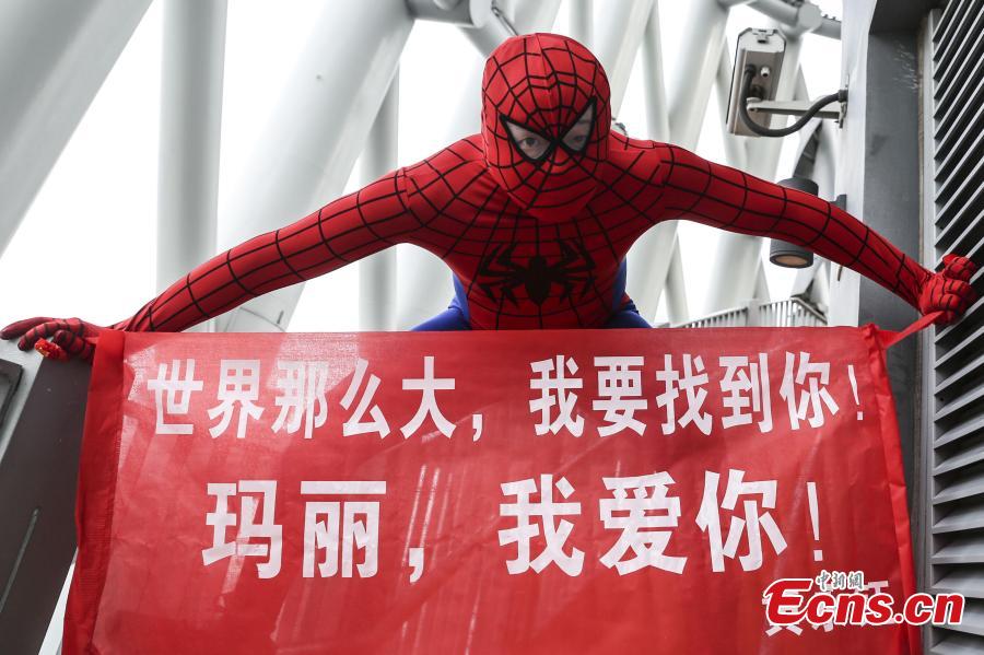 Huang Yongyu, dressed like Spiderman, collects signatures in support of him proposing to his girlfriend in Guangzhou city, capital of South China’s Guangdong province, May 20, 2015. Huang met his girlfriend, who goes by the user name Mary, on a dating app six months ago and decided to pop the big question on May 20, a contemporary local Valentine's Day chosen mainly for its phonetic similarities to the Chinese for "I love you". Huang wanted to collect 520 signatures to support his decision. (Photo: China News Service/Shi Yong)