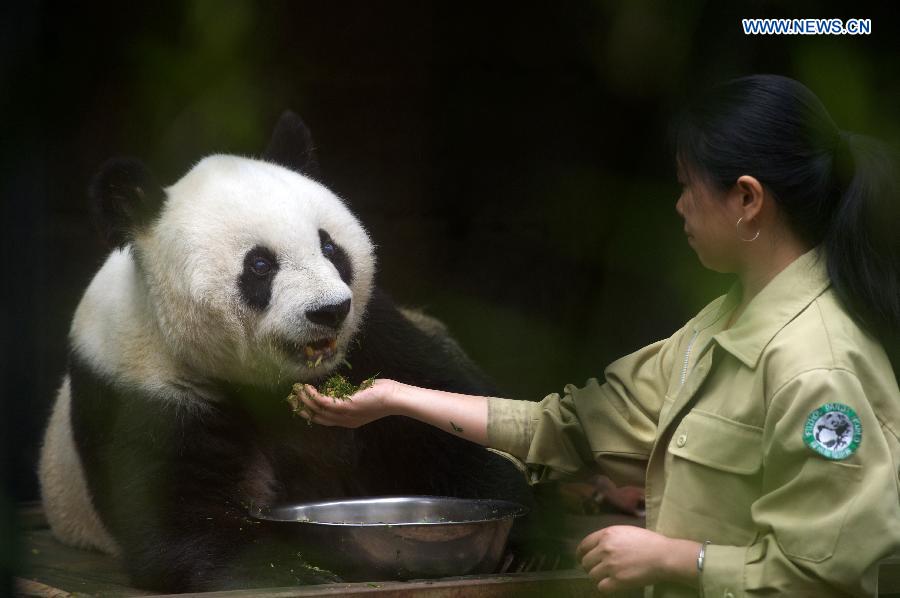 Breeder Shi Feining feeds the 35-year-old giant panda Basi at a giant panda research center in Fuzhou, capital of southeast China's Fujian Province, May 21, 2015. Basi, the equivalent of over 100 years in human age, is the oldest living giant panda in Chinese mainland. (Xinhua/Jiang Kehong)
