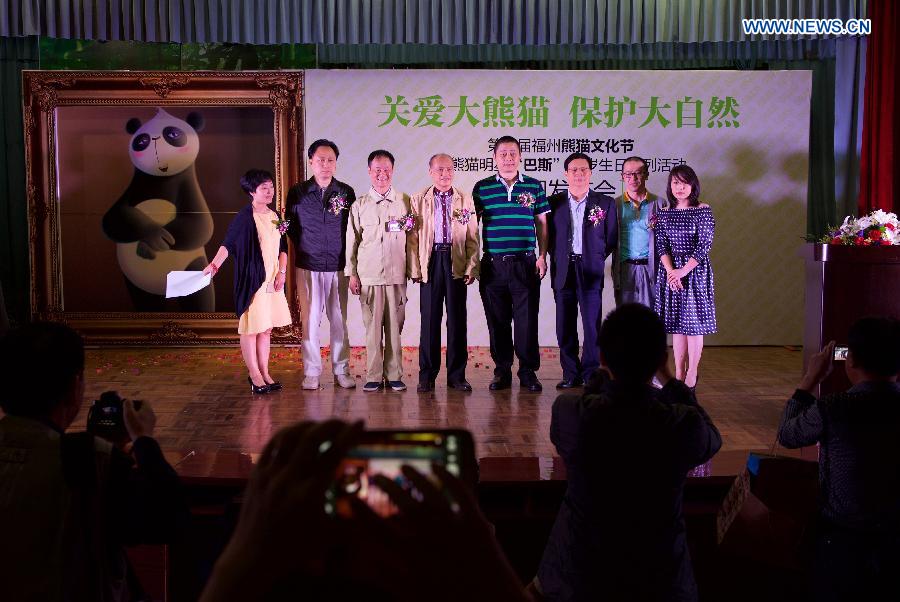 Guests pose for a photo at an activity celebrating the 35th birthday for giant panda Basi at a giant panda research center in Fuzhou, capital of southeast China's Fujian Province, May 21, 2015. Basi, the equivalent of over 100 years in human age, is the oldest living giant panda in Chinese mainland. (Xinhua/Jiang Kehong)