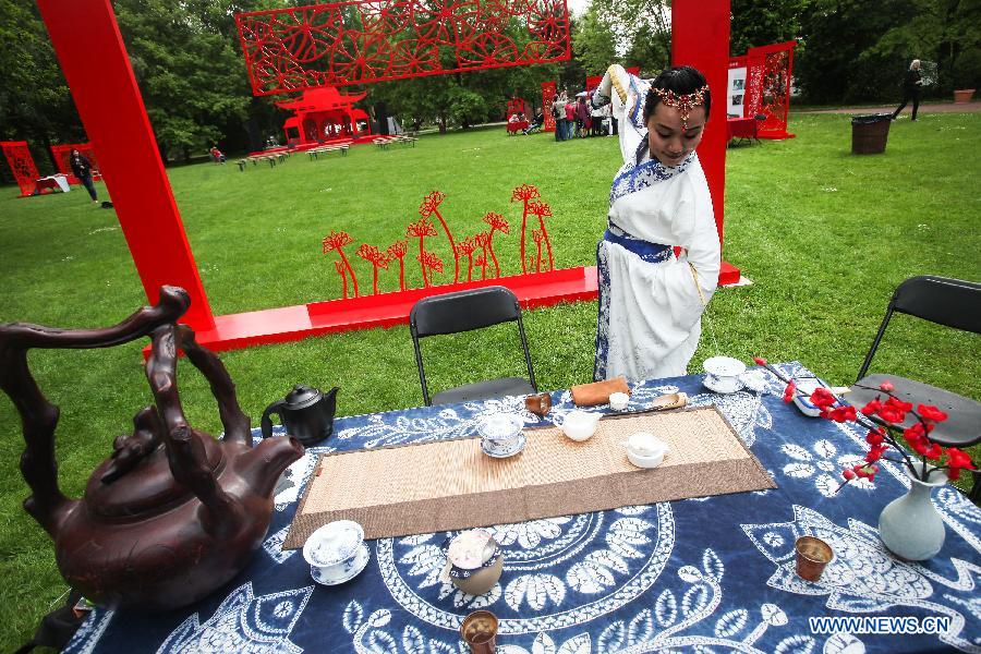 A tea artist displays tea art to visitors during the cultural event "Experience China" at the Gardens of the World in Berlin, Germany, on May 21, 2015. A serial of cultural events named "Experience China" was launched in Berlin's Gardens of the World as well as other places of the city. Highlights included food festival, film week and carnival parade. (Xinhua/Zhang Fan)