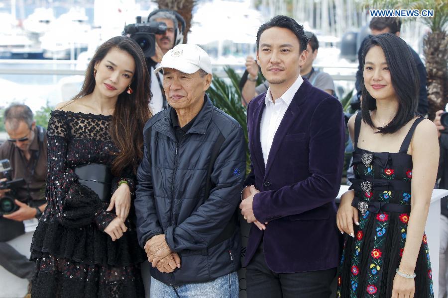 Director of the film "Nie Yinniang" (the Assassin) Hou Hsiao-Hsien (2nd, L) and cast members Shu Qi (1st, L), Chang Chen (2nd, R) and Zhou Yun pose for photos at the photocall during the 68th Cannes Film Festival in Cannes, France, on May 21, 2015. The film "Nie Yinniang" (the Assassin) would premiere at the 68th Cannes Film Festival on Thursday. (Xinhua/Zhou Lei)