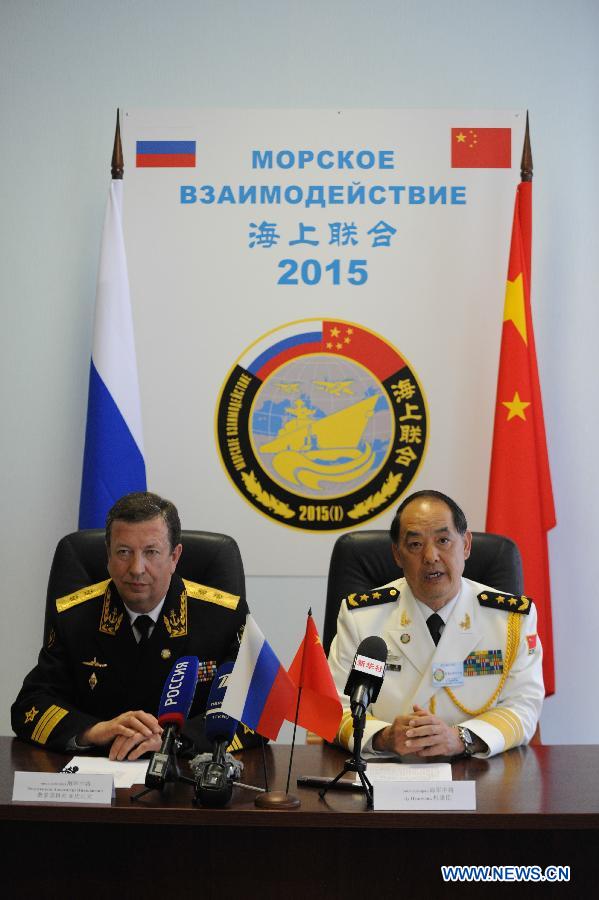 Du Jingchen(R), deputy commander of the Navy of the People's Liberation Army of China and Alexander Fedotenkov, deputy commander of the Russian Navy attend a joint press conference in Novorossiysk, Russia, on May 21, 2015. Chinese and Russian naval forces on Thursday ended their joint military exercises in the Mediterranean, according to an online news briefing from the Chinese Defense Ministry. (Xinhua/Dai Tianfang)