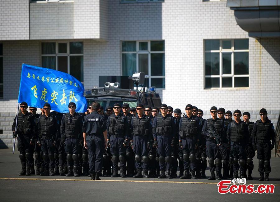 Members of the special police task force “Flying Tiger" train at a base in Urumqi city, capital of Northwest China’s Xinjiang Uygur autonomous region, May 21, 2015. The task force, which was established on May 22, 2010, has played an important role in counter-terrorism efforts and maintaining social stability, sources say. (Photo: China News Service/Liu Xin)