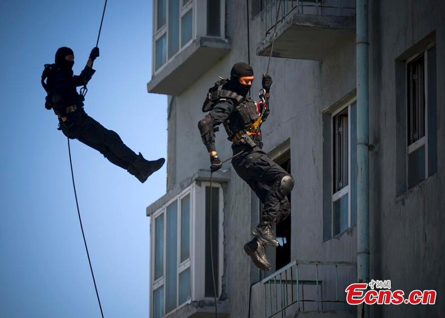 Members of the special police task force “Flying Tiger" train at a base in Urumqi city, capital of Northwest China’s Xinjiang Uygur autonomous region, May 21, 2015. The task force, which was established on May 22, 2010, has played an important role in counter-terrorism efforts and maintaining social stability, sources say. (Photo: China News Service/Liu Xin)