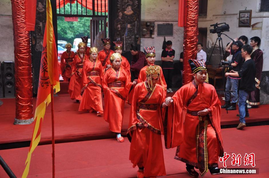 A Han style group wedding is held in a family temple in Rucheng, central China’s Hunan province on May 20, 2015. Wearing traditional Han costumes, 10 couples performed the ancient Han wedding ceremonies. (Chinanews/Lu Yi)