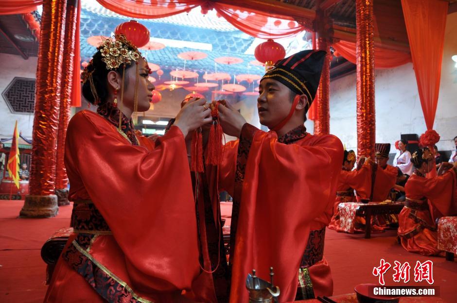 A Han style group wedding is held in a family temple in Rucheng, central China’s Hunan province on May 20, 2015. Wearing traditional Han costumes, 10 couples performed the ancient Han wedding ceremonies. (Chinanews/Lu Yi)