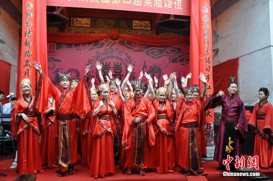 | A Han style group wedding is held in a family temple in Rucheng, central China’s Hunan province on May 20, 2015. Wearing traditional Han costumes, 10 couples performed the ancient Han wedding ceremonies. (Chinanews/Lu Yi) |