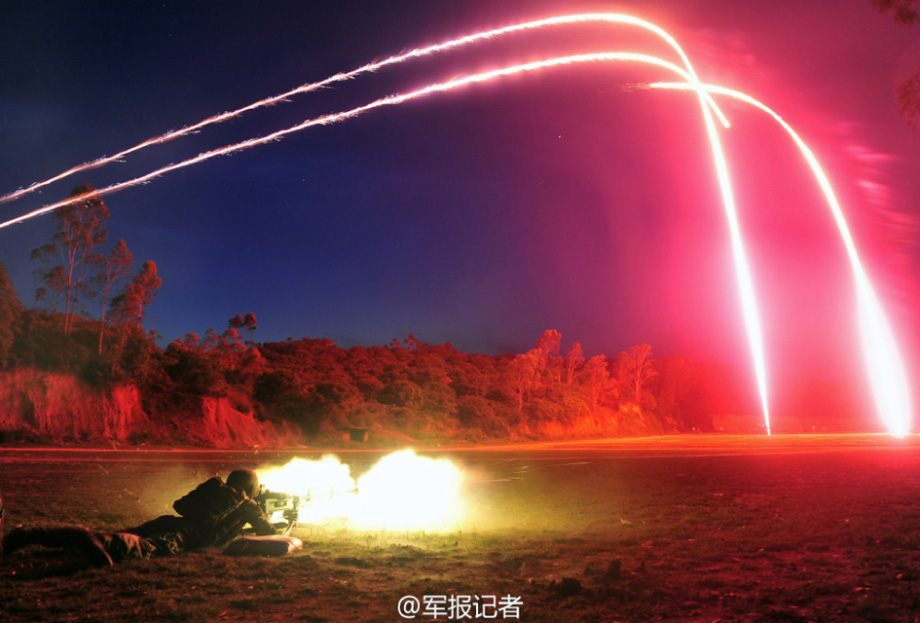 A regiment of China's 31st Group Army carries out live fire exercise with heavy machine guns to perfect their combat skills at night.(Photo/81.cn)