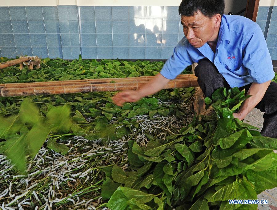 A farmer feeds mulberry leaves to the silkworms at Zhujiadou Village in Huzhou, east China's Zhejiang Province, May 23, 2015. Huzhou is a major cocoon-producing area of China which is expected to harvest about 5,400 tons of spring cocoons this year. (Xinhua/Tan Jin)