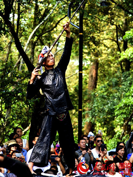 Located in mountain area south of Congjiang county, southwest China’s Guizhou province, Basha Miao village is a remote village that still maintains simple and unsophisticated folkway. With the special approval of the Ministry of Public Security, villagers here can possess guns. With the opening of the expressway and high speed rail that connect Congjiang with other cities, more and more tourists have come to visit this pristine village and watch their traditional dance. (Photo source: people.cn)