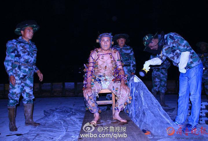 | Gao Bingguo is covered with bees during an attempt to break the Guinness World Record for being covered by the largest number of bees in Taian city, East China’s Shandong province, May 25, 2015. Despite bee stings, Gao set a new record for having 109.05 kg of bees on his body at one time. (Photo/Weibo of Qilu Evening News) |