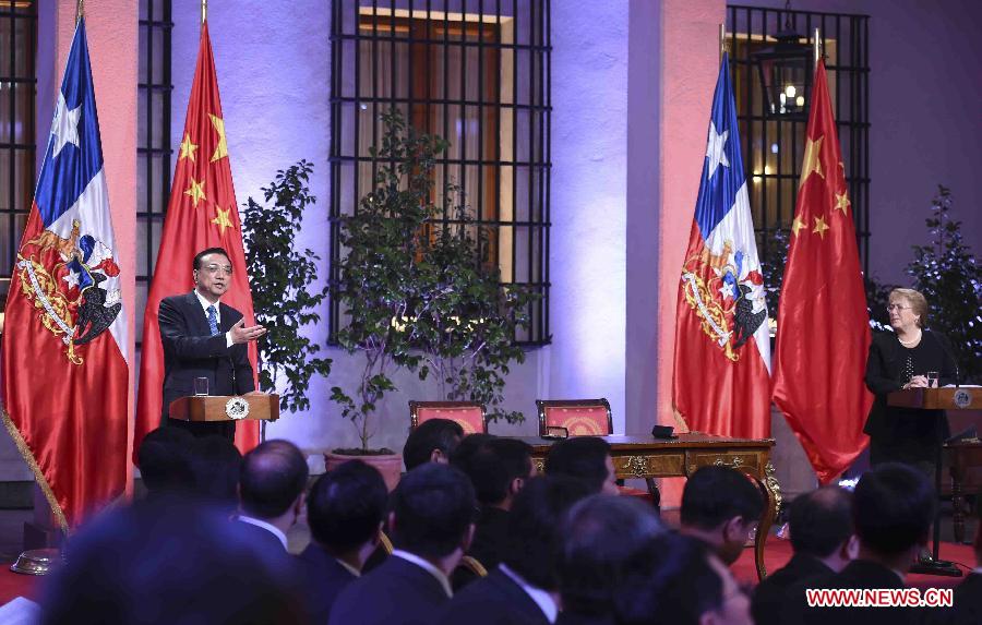 The latest development came after a meeting between visiting Chinese Premier Li Keqiang and Chilean President Michelle Bachelet, who jointly witnessed the signing of a series of bilateral business contracts and governmental accords in areas including politics, trade, finance, mining, agriculture, production capacity and science and technology.