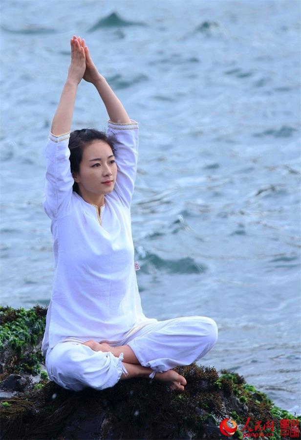 The photo shows a woman practicing yoga on the Yushan Island, near Ningbo, east China's Zhejiang province. Yushan Isand has abundant fish, shellfish and algae resources.(Photo/people.cn)