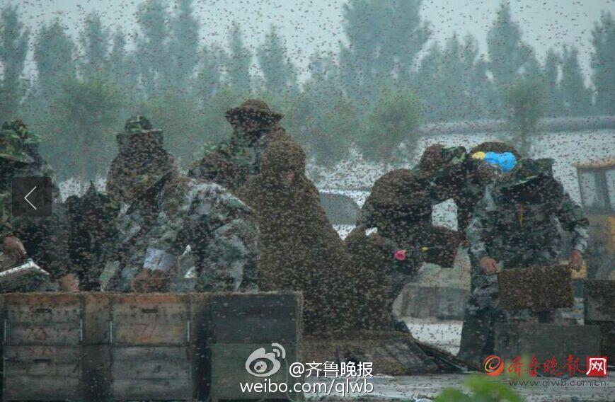 Gao Bingguo, a man from east China’s Shandong province, successfully sets a new Guinness record by covering his body in bees on May 25, 2015. Over a million bees covered his body like a bee garment. Gao got stung all over the body. (Photo source: Weibo of Qilu Evening News)