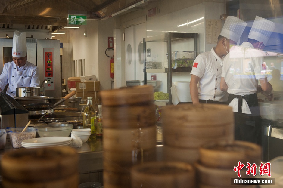 Chinese cooks are busy in the kitchen. (Chinanews/Li Qing)