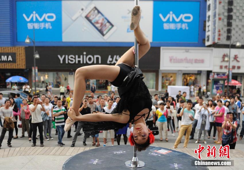 A girl performs pole dance in downtown Changchun, capital of northeast China's Jilin province, May 26, 2015. (CNS/Zhang Yao)