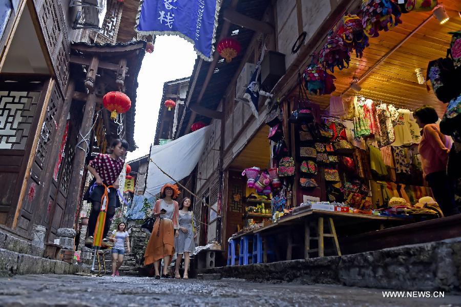 Photo taken on May 27, 2015 shows a street in Gongtan ancient town, southwest China's Chongqing. Located in the intersection of Wujiang River and Apeng River, Gongtan enjoys a history of over 1,700 years. Gongtan ancient town has now been developed into a tourist site after it was relocated a kilometer away from the original site in 2008 due to the construction of a hydropower station. (Xinhua/Chen Cheng)