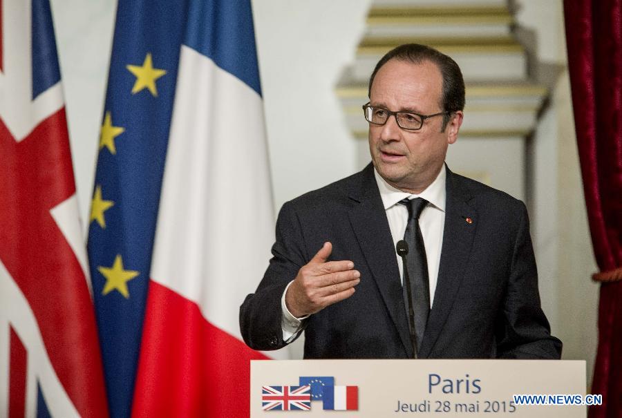 French President Francois Hollande attends a press conference in Paris, France, on May 28, 2015. French President Francois Hollande on Thursday received British Prime Minister David Cameron who started a European tour to build support for EU reforms before EU membership in-out referendum by the end of 2017. (Xinhua/Chen Xiaowei)
