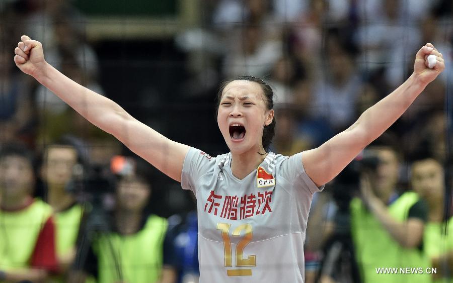 Hui Ruoqi of China celebrates during the final match against South Korea at the 18th Asian Senior Women's Volleyball Championships in Tianjin, north China, May 28, 2015. China won 3-0 to claim the title. (Xinhua/Yue Yuewei)