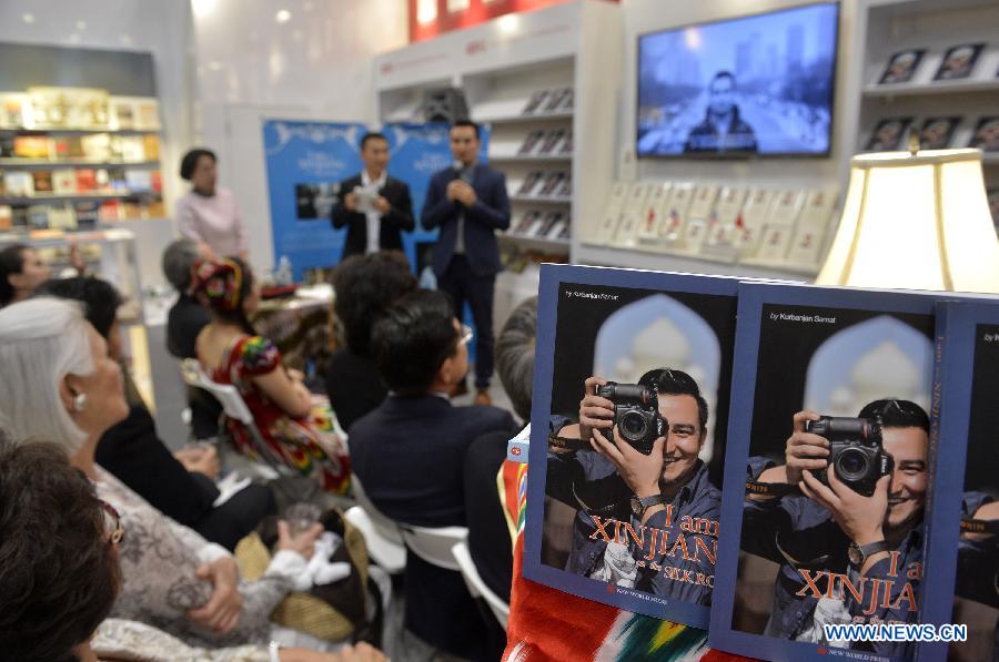 Photo taken on May 28, 2015 shows the English version of the book "I am from Xinjiang on the Silk Road" during its launching ceremony at the BookExpo America 2015 in New York City, the United States. (Xinhua/Wang Lei)