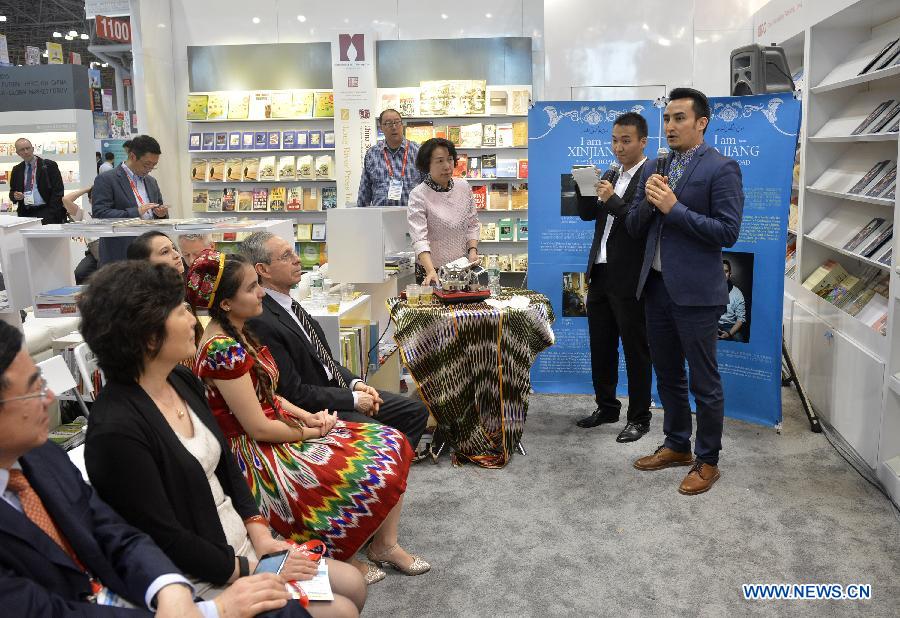Kurbanjan Samat (1st R), author of the book "I am from Xinjiang on the Silk Road", attends the launching ceremony of the English version of the book at BookExpo America 2015 in New York City, the United States on May 28, 2015. (Xinhua/Wang Lei)