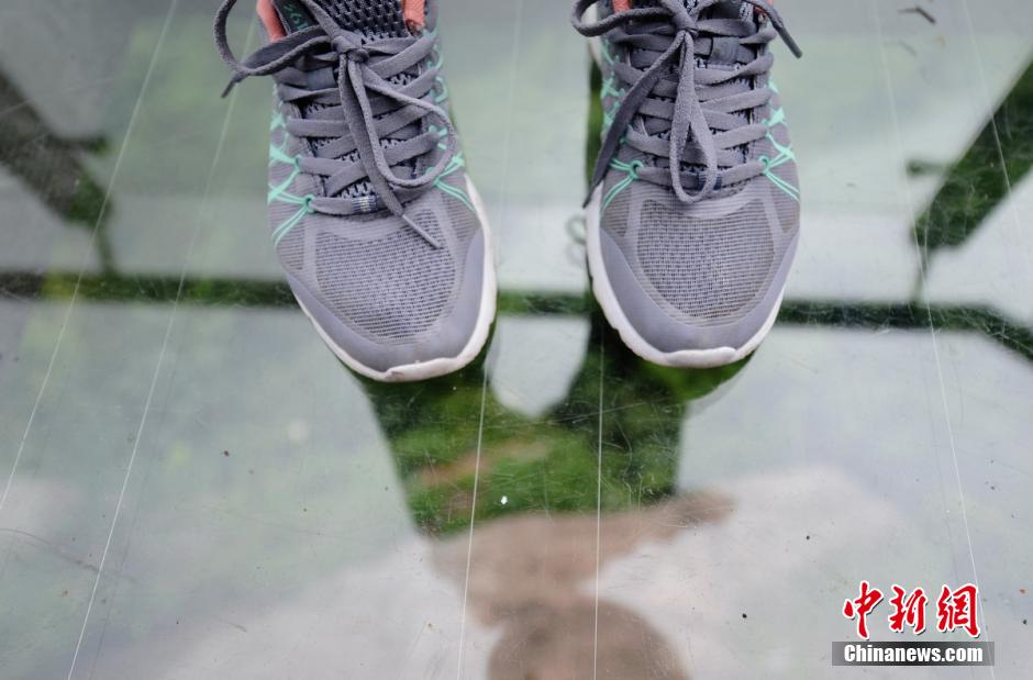 China’s first music glass gallery road is completed in Shiniuzhai National Geological Park in central China’s Hunan province on May 27, 2015. 180 meters long, this glass gallery road is built along a cliff 300 meters above the ground. The double-layer glass of the road is installed with inductive electron components, which can play 70 different musical notes. When the tourist steps on the road, it will play music. (Chinanews/Yang Huafeng)