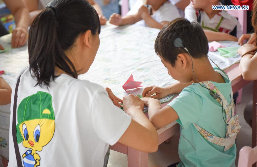 | Photo taken on May 22, 2015 shows children with audition problems and their parents preparing for a celebration at the China Deaf Children Healing Center in Beijing, capital of China. The International Children's Day will fall on June 1. (Xinhua/Bi Xiaoyang) |