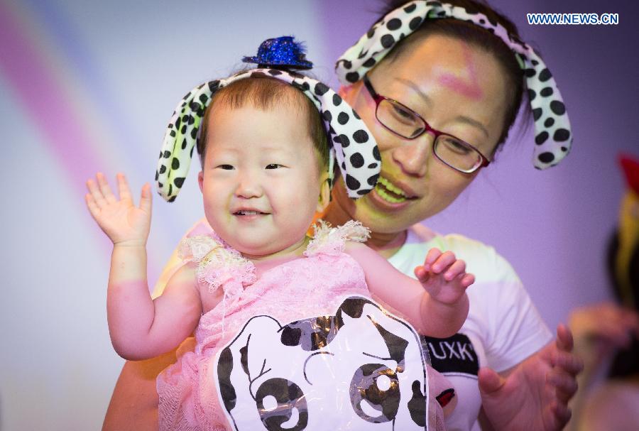 Photo taken on May 29, 2015 shows a parent and her child with audition problems performing during a celebration at the China Deaf Children Healing Center in Beijing, capital of China. The International Children's Day will fall on June 1. (Xinhua/Bi Xiaoyang)