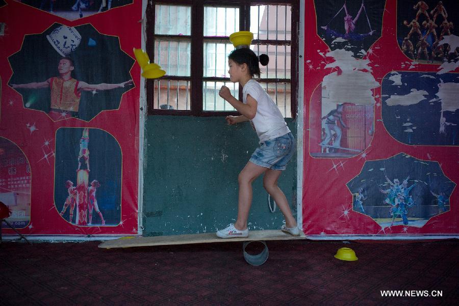 Photo taken on May 26, 2015 shows nine-year-old Jin Jiayi doing acrobatics exercises in an acrobatics school in Sanwang Village, Yingshang County of east China's Anhui Province. Founded in 2007, the acrobatics school in Sanwang Village enrolls more than a hundred children every year, who learn acrobatics for making a living. (Xinhua/Guo Chen)