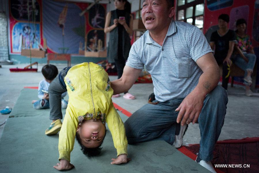 Photo taken on May 26, 2015 shows five-year-old Luan Haohao doing acrobatics exercises in the guidance of teacher Miu Honghu in an acrobatics school in Sanwang Village, Yingshang County of east China's Anhui Province. Founded in 2007, the acrobatics school in Sanwang Village enrolls more than a hundred children every year, who learn acrobatics for making a living. (Xinhua/Guo Chen)