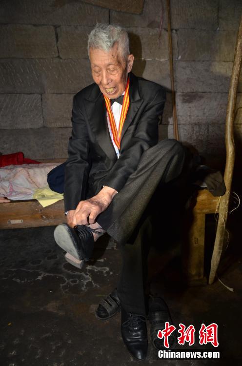 Yan Zhengming puts on new clothes. (Chinanews/Zhang Ji)