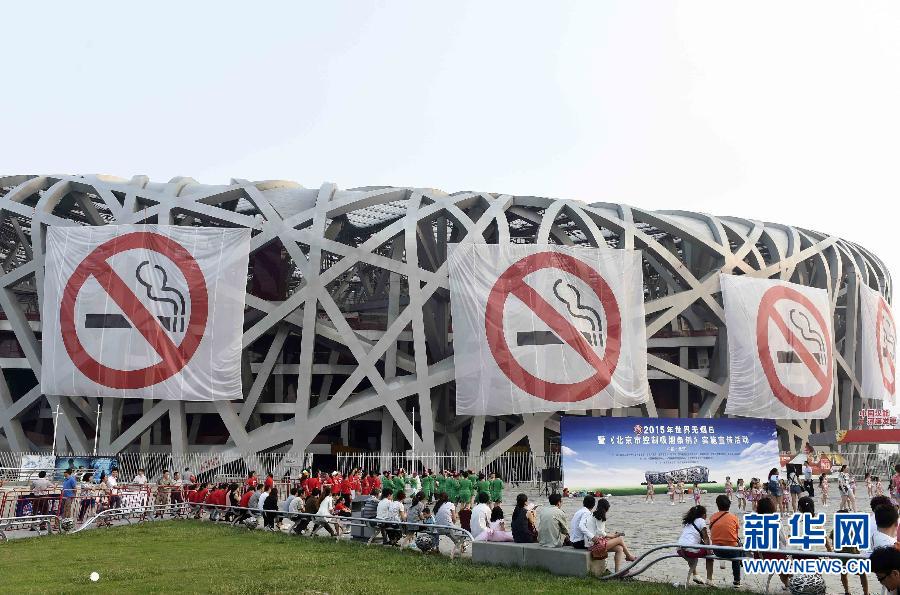 The government has hung no-smoking banners on Beijing's National Stadium, May 30, 2015. (Xinhua/Gong Lei)