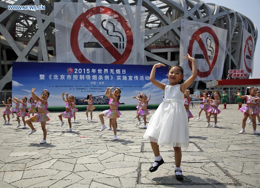 Children dance in front of anti-smoking banners displayed on the iconic Bird's Nest National Stadium during an event marking World No Tobacco Day in Beijing, May 31, 2015. (Xinhua/Shen Bohan)
