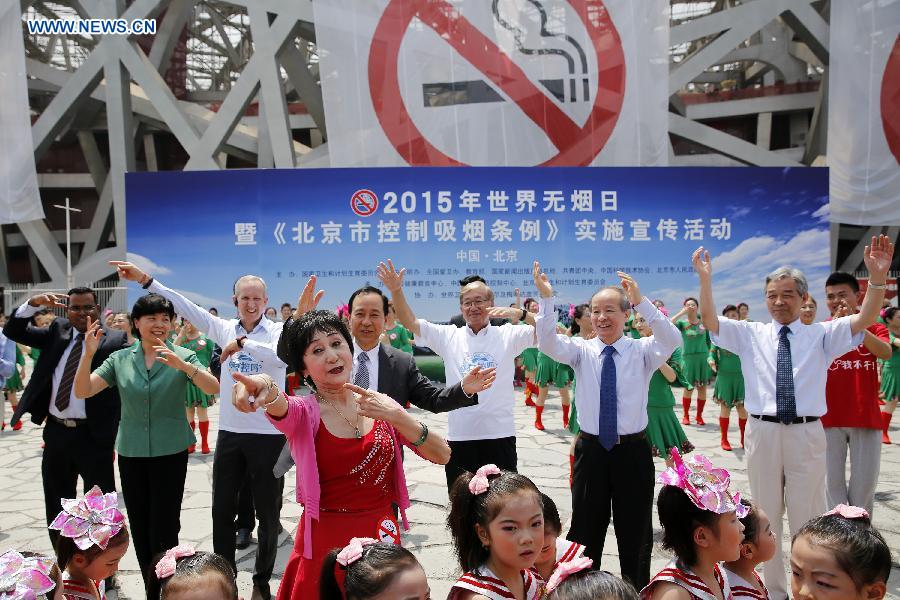 People dance in front of anti-smoking banners displayed on the iconic Bird's Nest National Stadium during an event marking World No Tobacco Day in Beijing, May 31, 2015.(Xinhua/Shen Bohan)