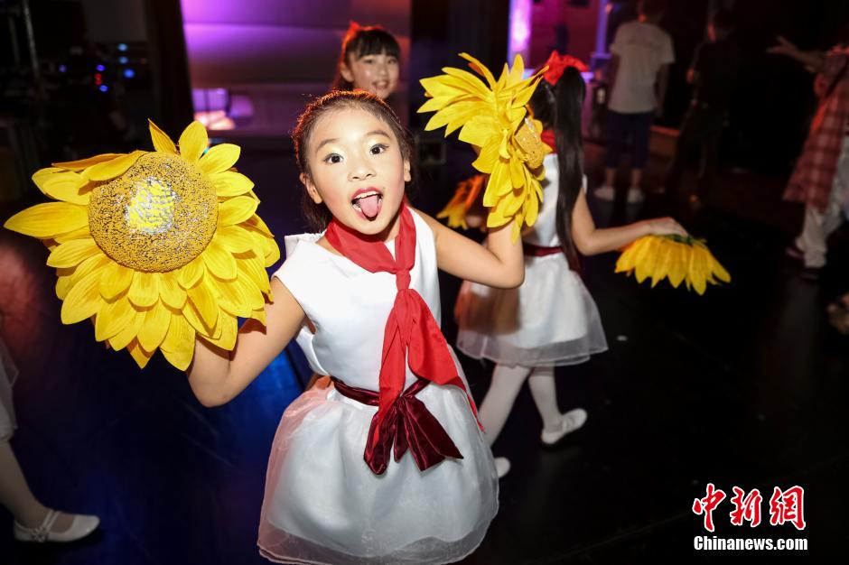 A child poses for a photo behind the T-stage after the show. The awarding ceremony of the Third China (Zhili) National Children's Wear Contest was held in Huzhou City, east China's Zhejiang Province, May 31, 2015. Zhili Town, located in the Wuxing District of Huzhou City, is famous for its children's wear industry. (CNS/Xiong Ran)