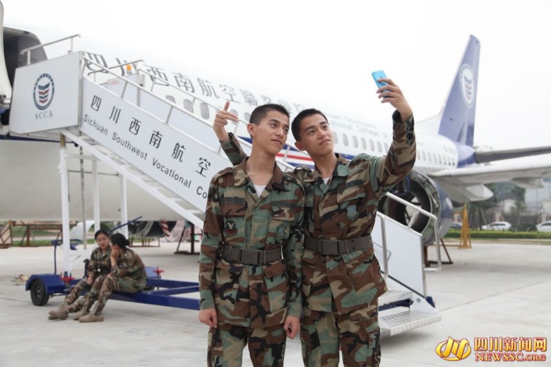 Twins who will become flight attendants take a selfie in Sichuan Southwest Vocational College of Civil Aviation. (Photo/newssc.org)