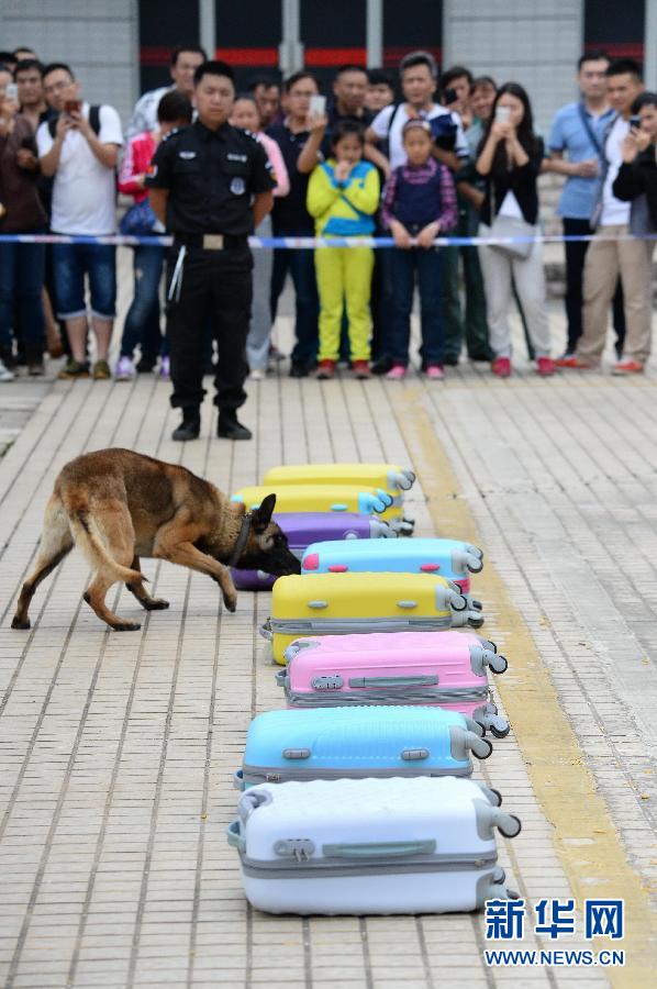 A police officer trains a police dog to identify drugs on May 17, 2015. (Xinhua/Qiao Qiming)