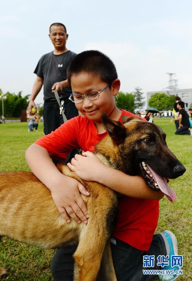 A boy hugs a police dog on May 17, 2015. (Xinhua/Qiao Qiming)