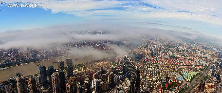 Photo taken from Shanghai Tower on July 8, 2014 shows a view of downtown Shanghai, east China. Shanghai Tower, a megamall skyscraper under construction, stands approximately 632 meters high and has 128 stories, with a total floor area of 380,000 square meters. It's projected to open to the public in mid-2015. (Xinhua/Huang Weiguo)