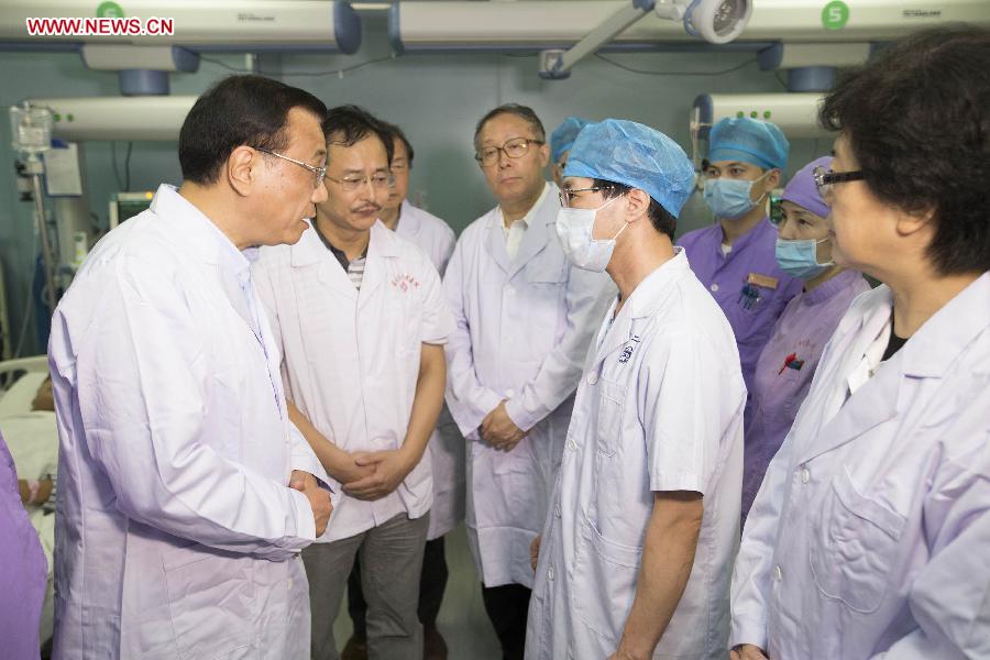 Chinese Premier Li Keqiang calls upon survivors of the overturned ship at a hospital in Jianli County, central China's Hubei Province, June 2, 2015. The ship, named Dongfangzhixing, or Eastern Star, sank at around 9:28 p.m. (1328 GMT) on Monday in the Jianli section of the Yangtze River. Carrying 405 passengers, five travel agency workers and 47 crew members, the ship was heading from Nanjing, capital of east China's Jiangsu Province, for southwest China's Chongqing Municipality. (Xinhua/Ding Lin)