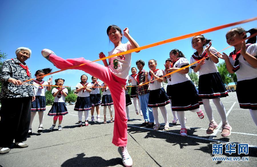Pupils in a primary school play rubber band skipping in Shenyang, capital of northeast China's Liaoning province, May 30, 2013. (Xinhua/Zhang Wenkui)