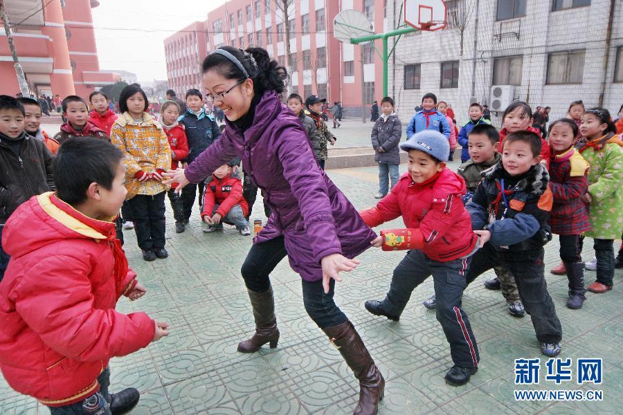 A teacher plays "Chicken vs Eagle" game with pupils in a primary school in Ganyu County, east China's Jiangsu province, Nov. 20, 2009. (Xinhua/Si Wei)