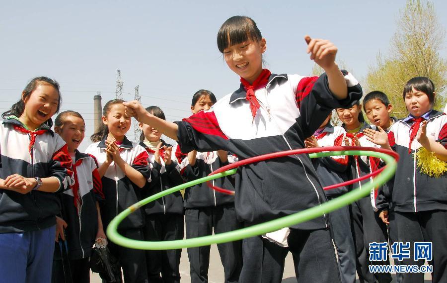 Students play hula hoop in a middle school in Xinjiang Uygur Autonomous Region, April 14, 2008. (Xinhua/Ma Jun)
