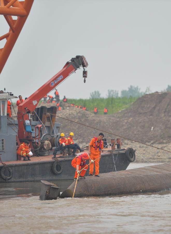 | Rescuers are seen on the cruise ship Eastern Star that capsized late on Monday in the Jianli section of the Yangtze River in central China's Hubei Province, June 3, 2015. Rescuers have only found 14 survivors, and so far have retrieved 26 bodies, leaving over 400 people still unaccounted for. (Xinhua/Bai Yu) |