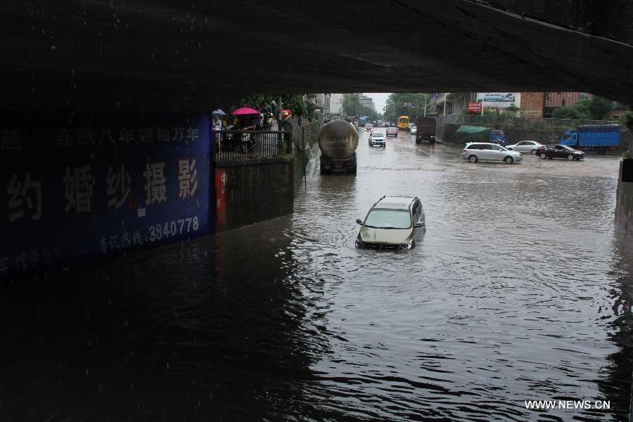 A man transports materials in his flooded bamboo ware factory in Dexing City, east China's Jiangxi Province, June 3, 2015. Torrential downpours swept through provinces Jiangxi and Guizhou on Wednesday. (Xinhua/Zhuo Zhongwei)