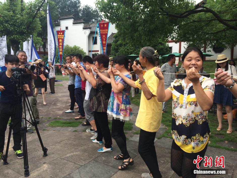 450 tourists, side by side, hold a 300-meter-long noodle in Pujiang county, east China’s Zhejiang province on June 2, 2015. Also called “longevity noodle”, the long noodle is a local specialty. (Chinanews/Xi Jinyan)