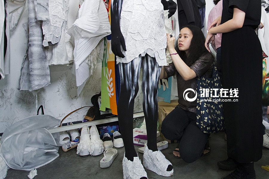 Mei helps the models dress up. (Photo source: zjol.com.cn)